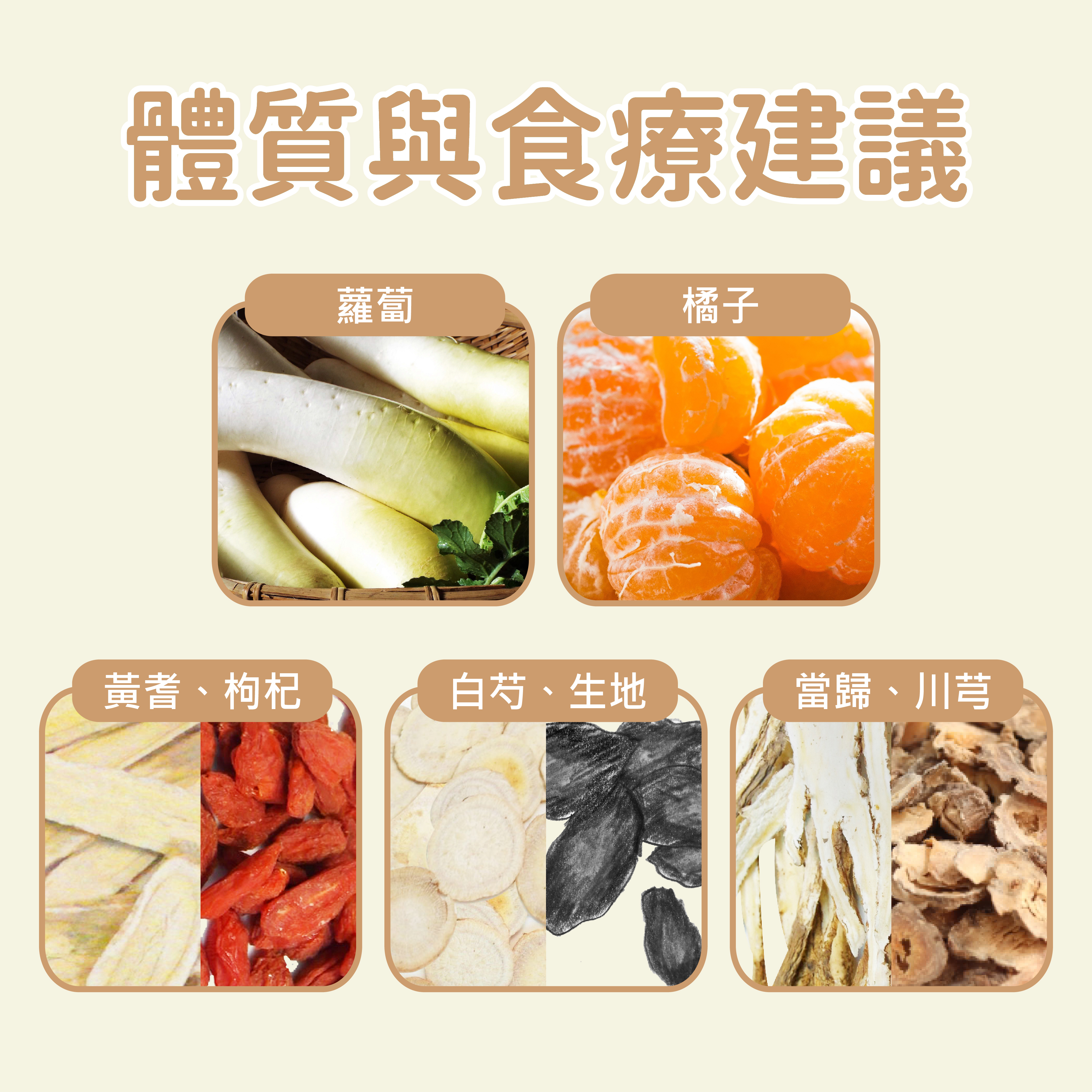 橘子:理氣、消食,可緩解氣機不順、消化不良,同時富含高量維生素 A,有助皮膚光澤。
