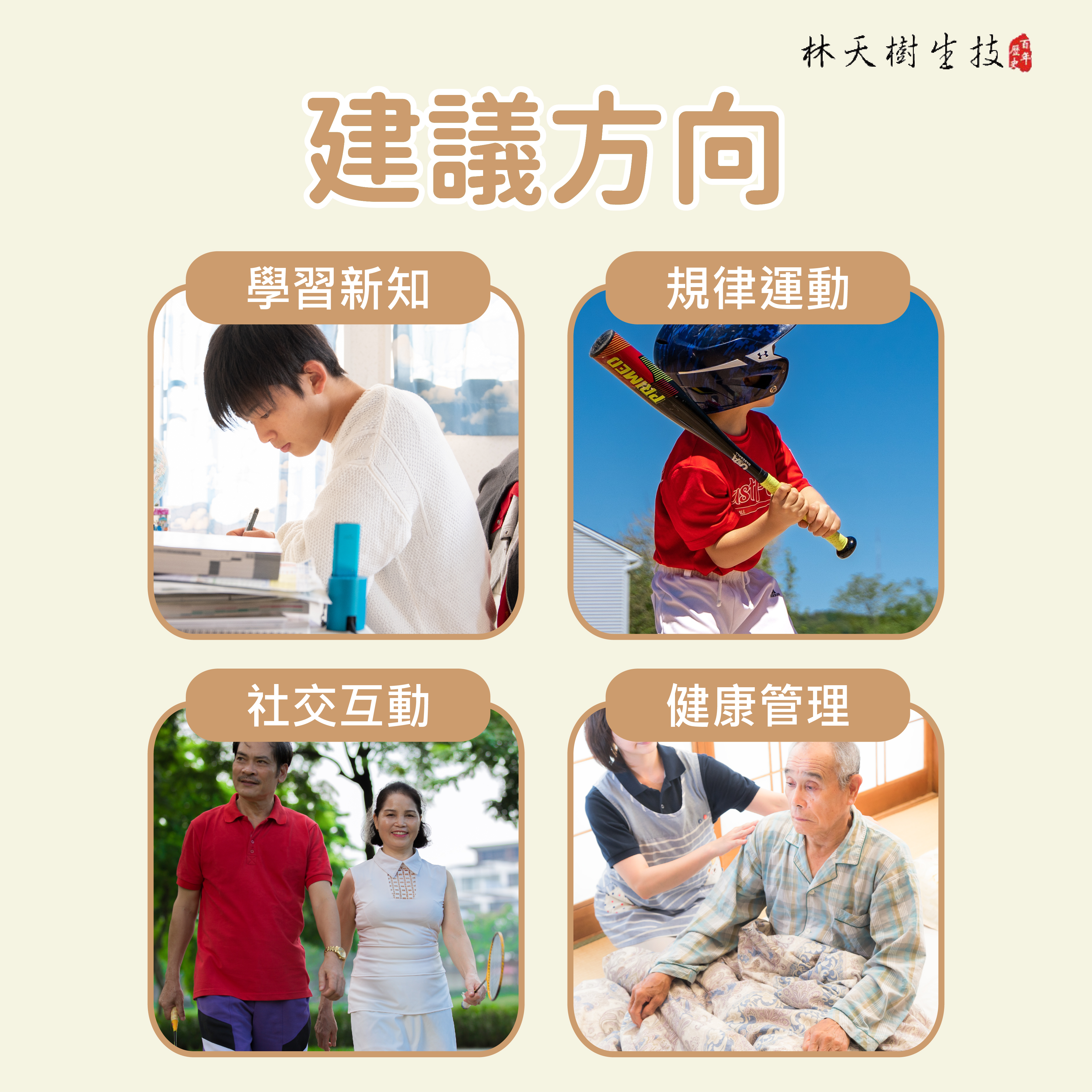 - 健康管理:避免「三高」(高血壓、高血脂、高血糖)與肥胖,因為這些都是失智的危險因子。保持生活規律化,是維持身心健康的基礎。