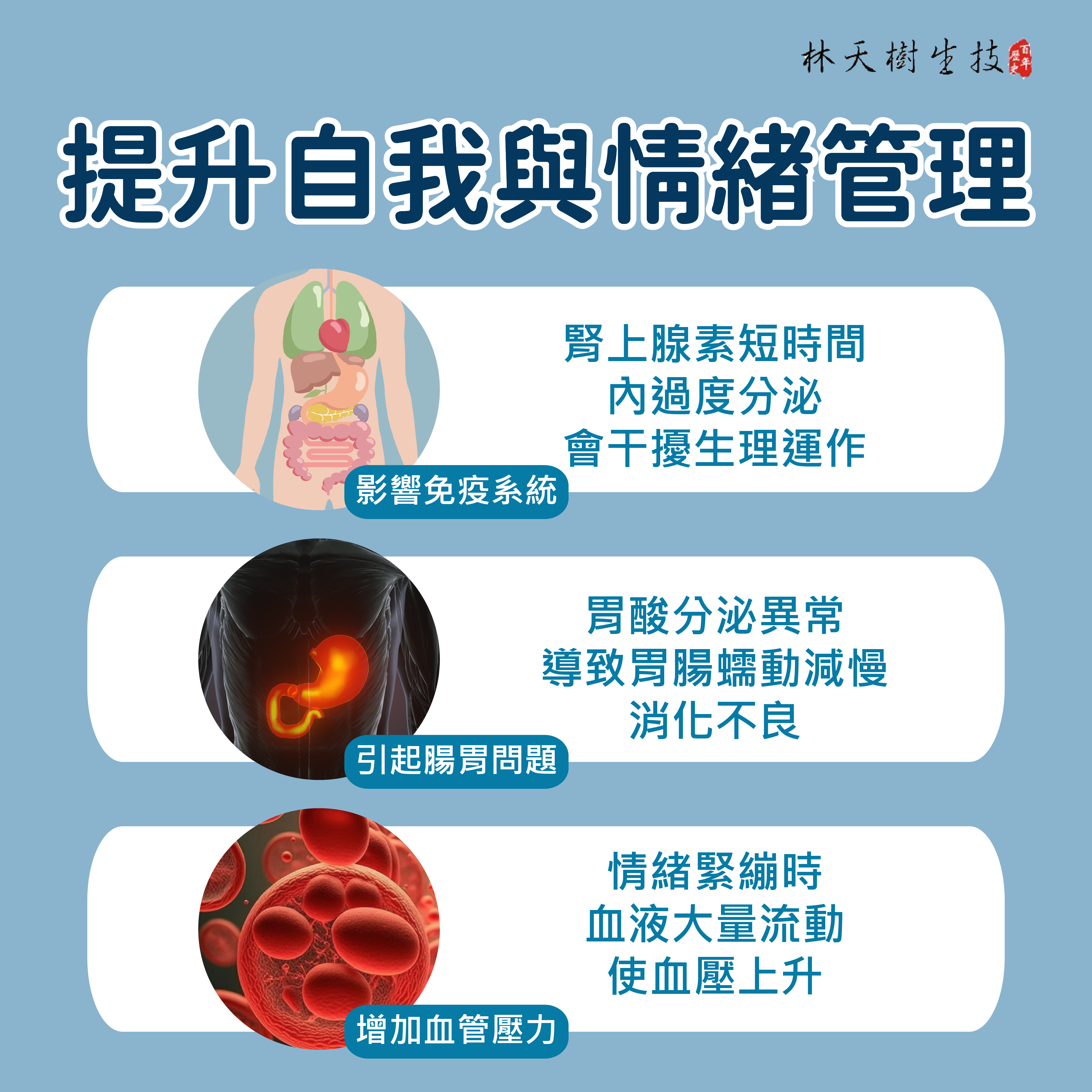 - 影響免疫系統:腎上腺素短時間內過度分泌,會干擾生理運作。