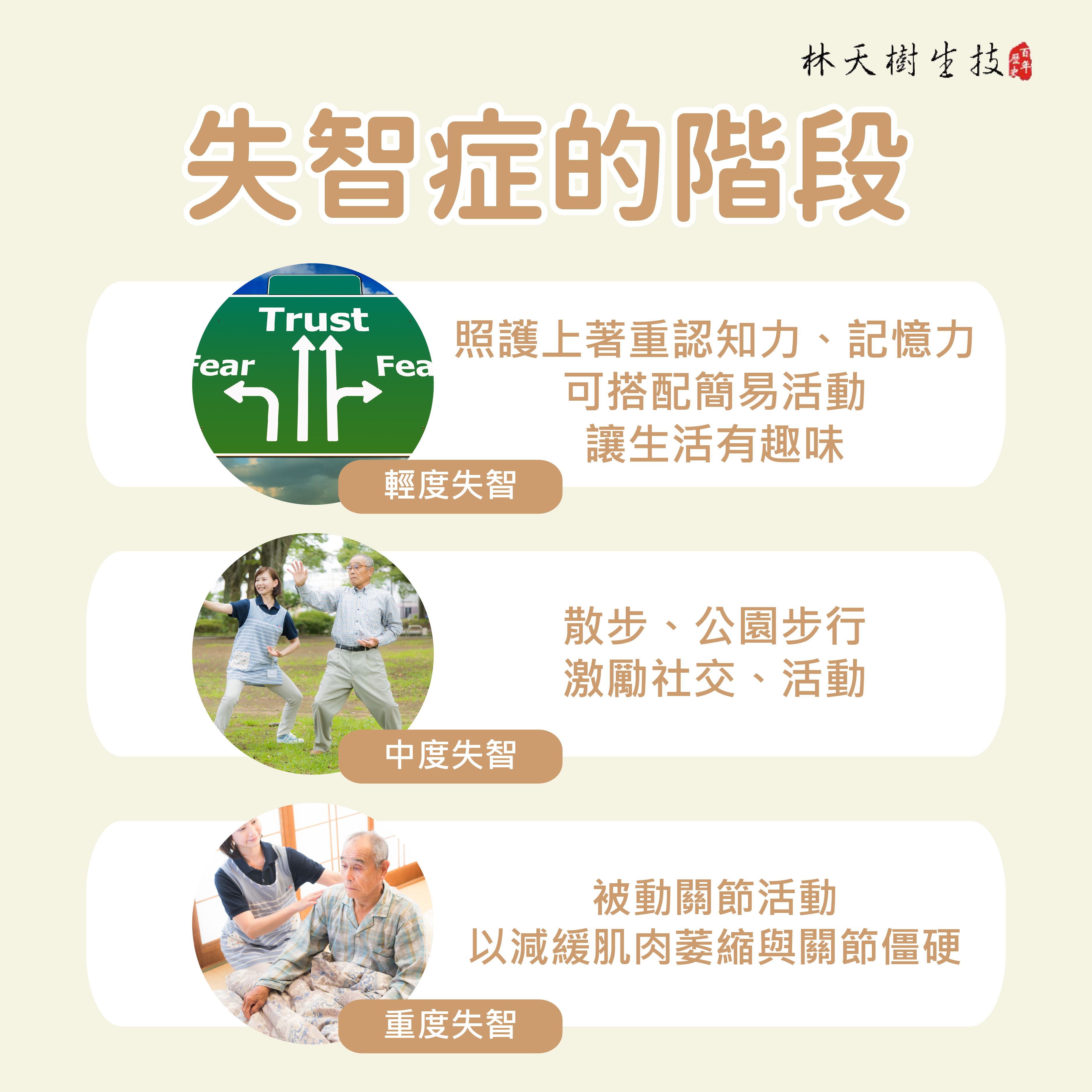 依病程演變,失智症一般可分為:輕度失智、中度失智、重度失智。