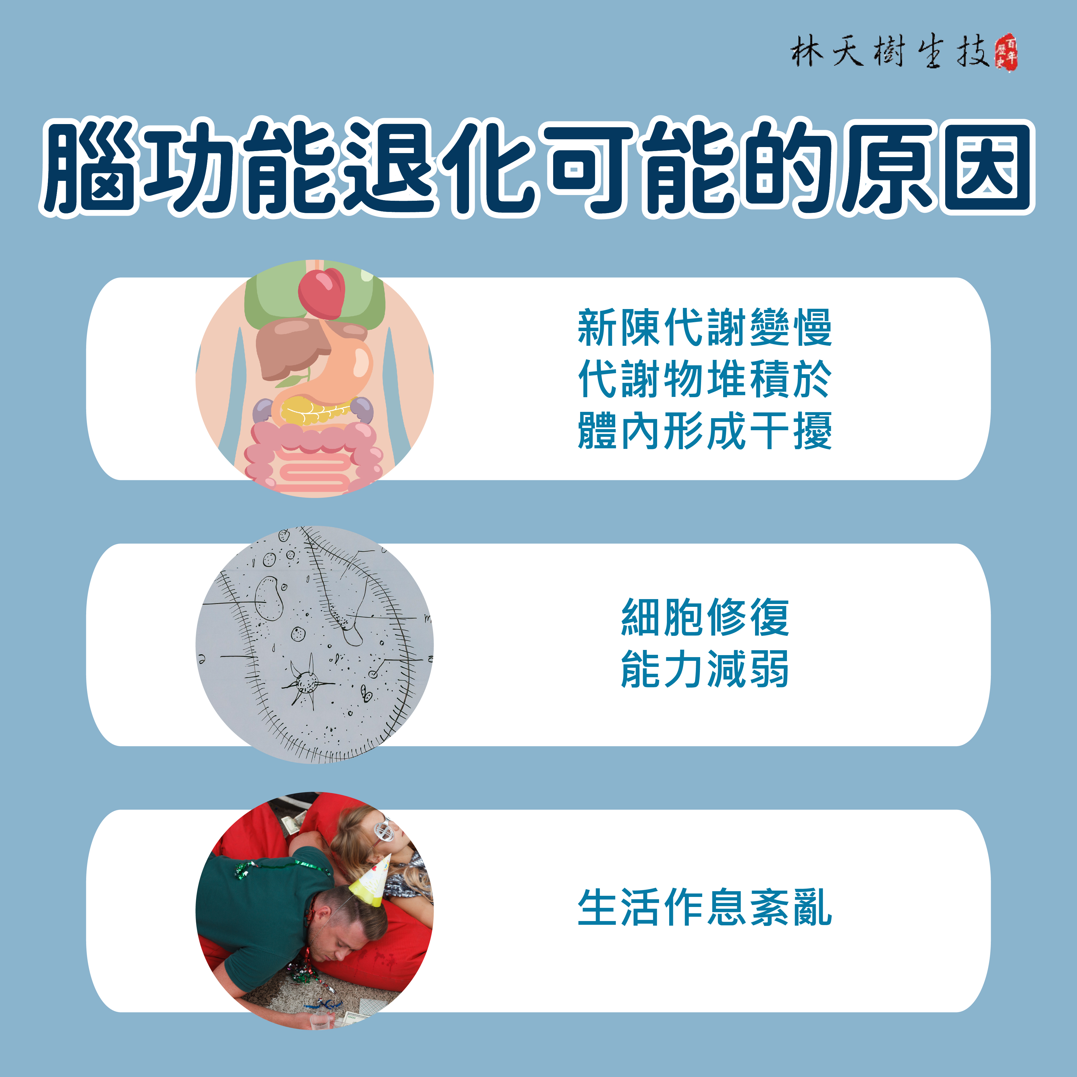 人體機能若發生退化,往往會出現神經系統紊亂,血壓、血脂、血糖等代謝異常,細胞與組織產生慢性發炎、過敏等現象。