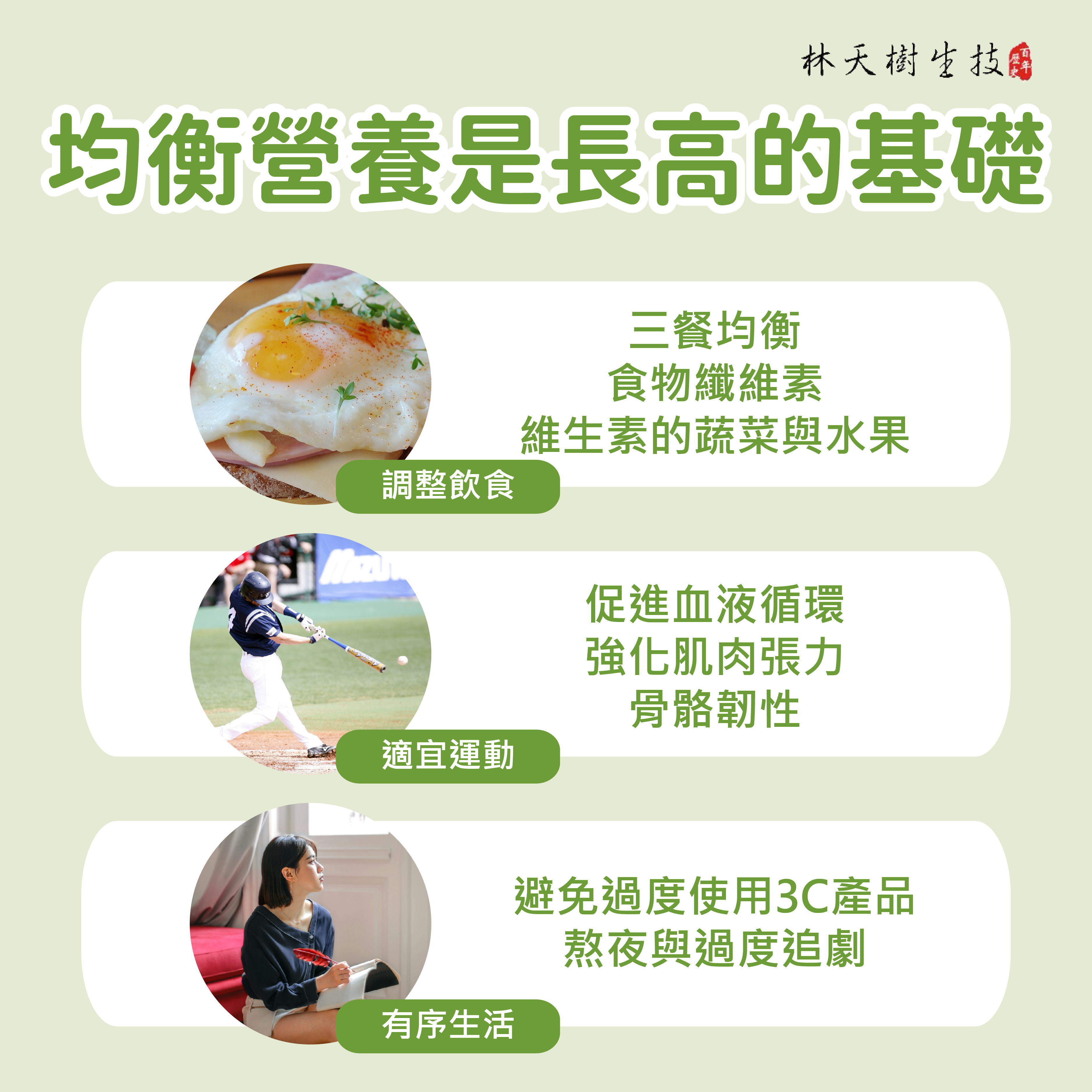 同時,作息紊亂會引發代謝、循環、內分泌等功能失調,進而產生許多健康問題。青春期長高建議從飲食開始,選擇合宜的烹調油品,多吃蔬果、蛋、肉類食物,才是開啟長高的關鍵。