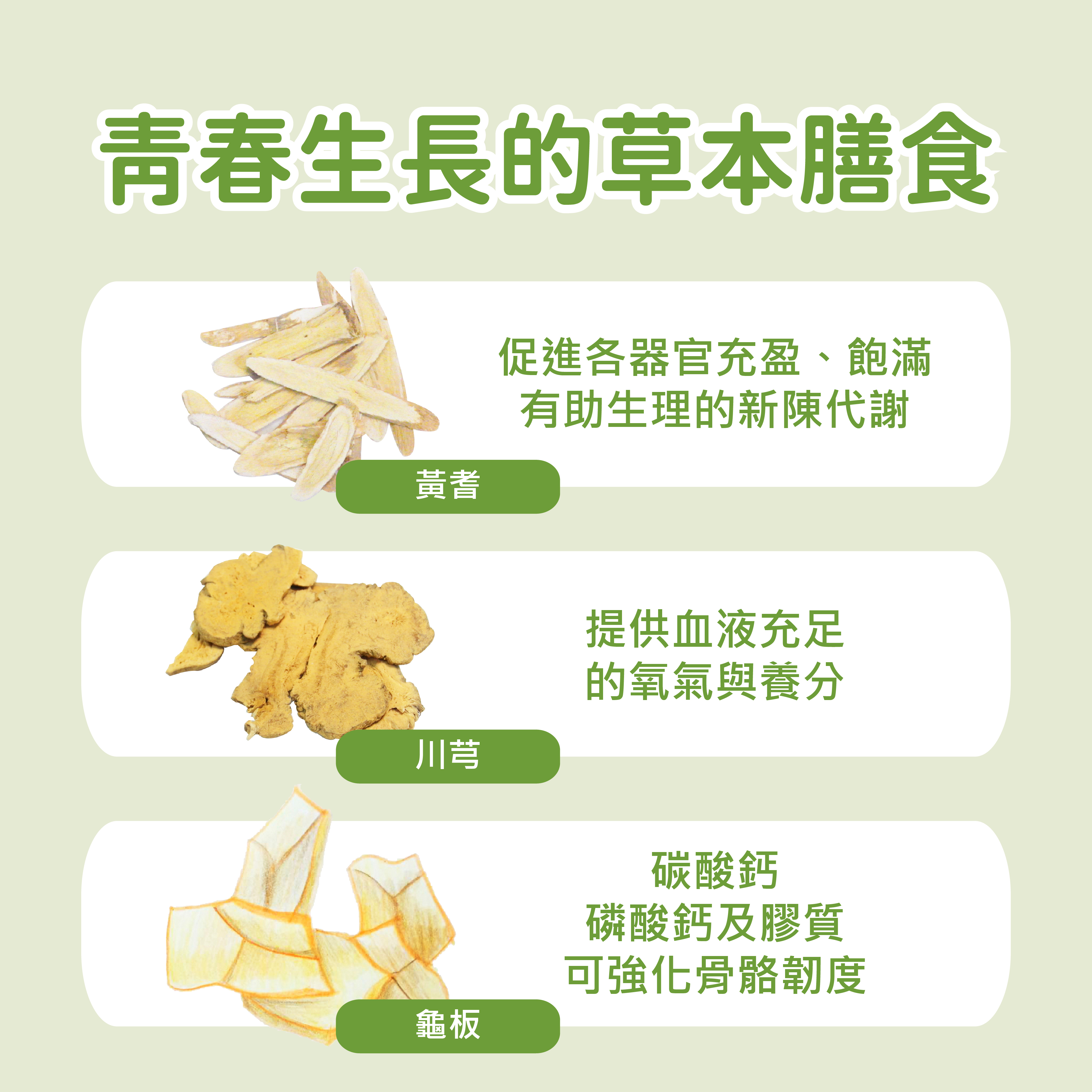 - 黃耆:可提升機體活力,促進各器官充盈、飽滿,有助生理的新陳代謝。